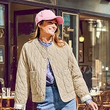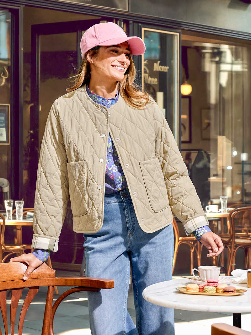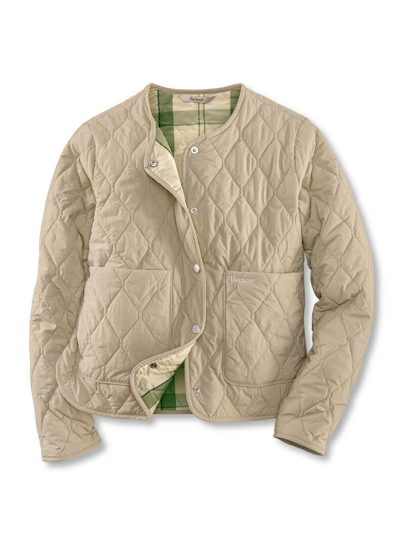 Mit ihrem sportiven Style ist diese leichte Steppjacke von Barbour ein modisches Highlight in diesem Frühling! Die leicht oversized geschnittene Form liegt im Trend und sieht auch zu längeren Oberteilen im Lagenlook klasse aus. Klassischer Rautenstepp kombiniert mit einem natürlichen Sandton, der frisch wirkt und dem Teint schmeichelt. Topaktuell ist das schnörkellose Design ganz ohne Kragen oder Bündchen. Einzig zwei aufgesetzte Taschen, die man auch von der Seite benutzen kann, und eine Druckknopfleiste vervollkommnen den Look. Coole Details sind die beiden 10 cm langen, abgerundeten Seitenschlitze im Saum und das exklusive Barbour-Tartanfutter in Salbei-Ecru! Mit Logo-Stickerei auf einer Tasche. Bequeme, kürzere Passform (Modern Fit). Länge ca. 60 cm. Farbe: Sand. Original Barbour.