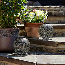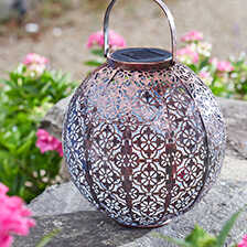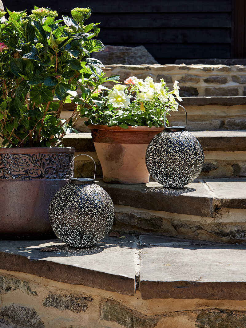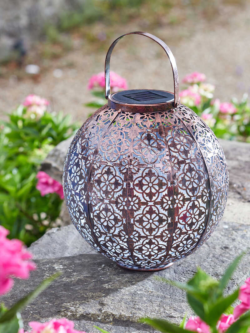 Eine echte Augenweide am Sommerabend ist diese elegante Solarlaterne aus Metall! Das Muster der Lampe wird durch ein helles, angenehmes Licht (weiße LED) reflektiert und zeichnet so zauberhafte Ornamente auf den Boden und die Wand. Tagsüber lädt die Laterne die Solarbatterie im direkten Sonnenlicht auf, welches sie in den Abendstunden für ca. sechs Stunden in Form des stimmungsvollen Lichtspiels wieder abgibt. Höhe 23 cm, Durchmesser 22 cm. Von Smart Garden Products Ltd., Oxfordshire.
