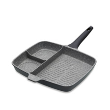 Sparen Sie Platz und Zeit - Sie werden diese handliche Grillpfanne lieben, denn sie ist perfekt für die Zubereitung eines englischen Frühstücks! Die hochwertige, zweischichtige, kratzfeste Antihaft-Multipfanne aus Guss-Aluminium ist in drei Bereiche unterteilt, sodass Sie zeitgleich z. B. Speck, Champignon und Eier braten können und weniger Platz auf dem Herd benötigen. Natürlich lassen sich auch andere Köstlichkeiten in dieser erstklassigen Pfanne zaubern. Dank der Beschichtung benötigen Sie kein Öl oder Kochfett. Wir haben sie selbst getestet und sind restlos begeistert von der Topqualität dieser Masterclass-Pfanne! Für alle Herdarten inkl. Induktion geeignet. Größe ohne Griff: 32 x 32 cm. Aus der Masterclass-Serie von Kitchencraft, Birmingham.