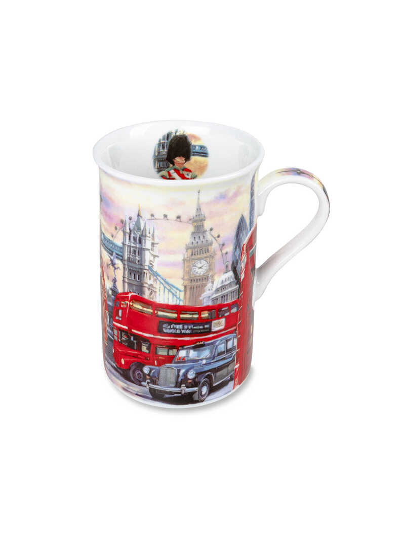 Dieser klassische Becher ist eine echte Liebeserklärung an die Hauptstadt des britischen Königreiches und zeigt die unverwechselbaren Wahrzeichen wie den Tower of London, den traditionellen roten Bus, das legendäre Taxi, St. Paul's Cathedral und die Horseguards. Genießen Sie Ihren englischen Tee oder einen guten Kaffee aus diesem prachtvollen Becher. Lieferung in passendem Geschenkkarton. Höhe 9,5 cm, 8,5 cm. Aus der Leonardo-Collection von Lesser & Pavey, Kent.
