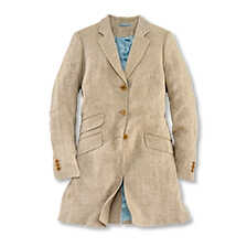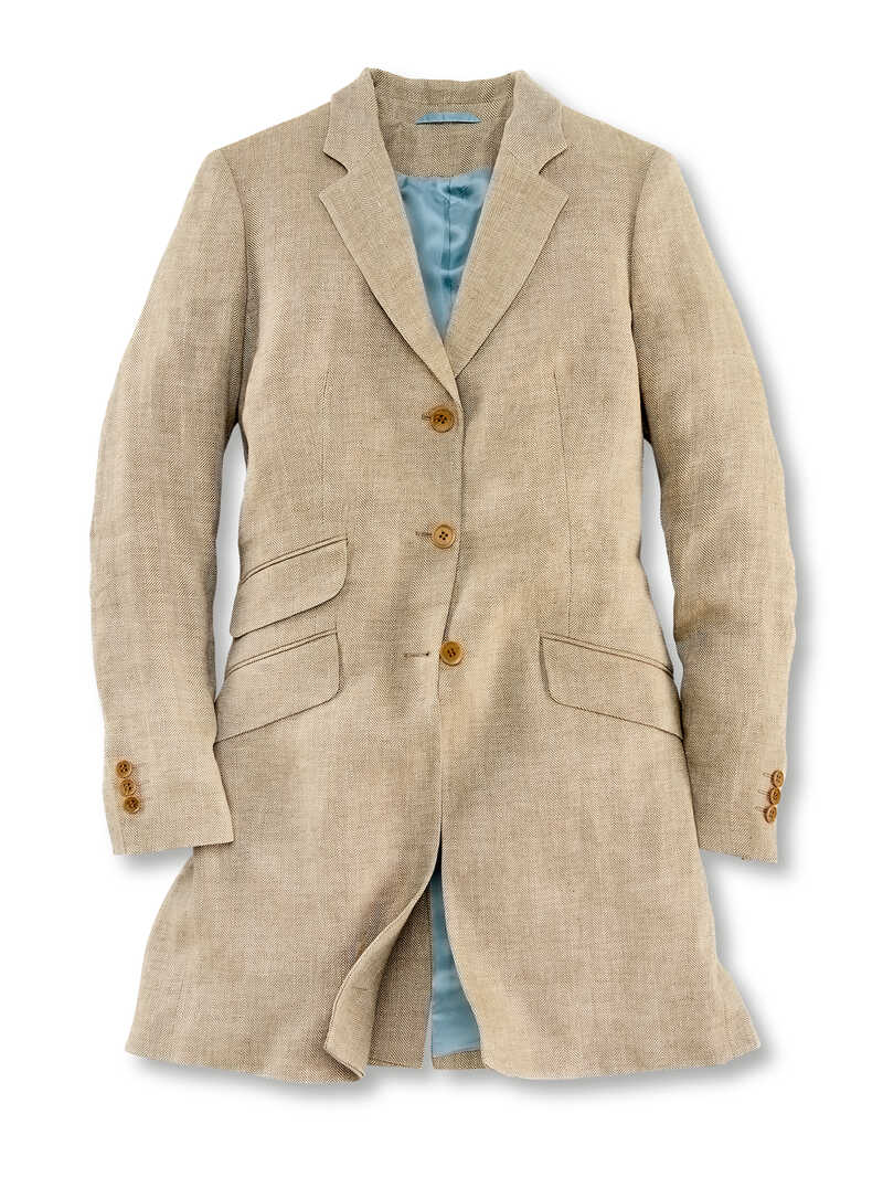 Das Geniale an diesem modernen Gehrock ist seine Vielseitigkeit, denn er kann als Longblazer oder Kurzmantel getragen werden. Zudem ist er durch seine Länge und ausgefeilte Schnittführung unglaublich figurschmeichelnd. Passend zum Frühling und Sommer ist Evie aus reinem Leinengewebe gearbeitet. Kein Geringerer als der irische Edelweber Emblem Weavers ist für dieses exquisite Fischgrat-Gewebe verantwortlich. Hochwertige Details wie die Steinnussknöpfe, zwei Pattentaschen, eine Billett-Tasche und ein verdeckter Gehschlitz runden den Look ab. Tragen Sie diesen puristischen Gehrock lässig mit Shirt, Jeans und Sneakers oder mit Bluse zu schickeren Anlässen. Taillierte Passform (Regular Fit). Länge ca. 84 cm. Farbe: Sand. Original Charles Robertson.