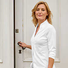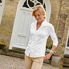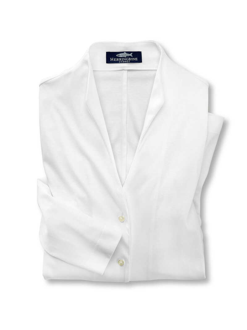 Die edle Zutat dieser Jerseybluse ist so einfach wie genial: feinster Swiss Cotton! Dieser samtweiche und äußerst luxuriöse Jersey fühlt sich fantastisch auf der Haut an und ist durch seine Elastizität sehr bequem und bügelleicht. Der weich fließende Baumwolljersey wird durch den minimalistischen Schnitt noch unterstrichen. Im Fokus liegen der schmeichelhafte Kelchkragen-Ausschnitt und die Knopfleiste. Der unaufgeregte Stil dieser elastischen Bluse passt wunderbar zu etlichen Anlässen! Mit breit abgestepptem, geradem Saum und mittlere Naht im Rückteil. Schmale, taillierte Passform (Modern Fit). Länge ca. 70 cm. Farbe: Weiß. Original Herringbone.