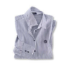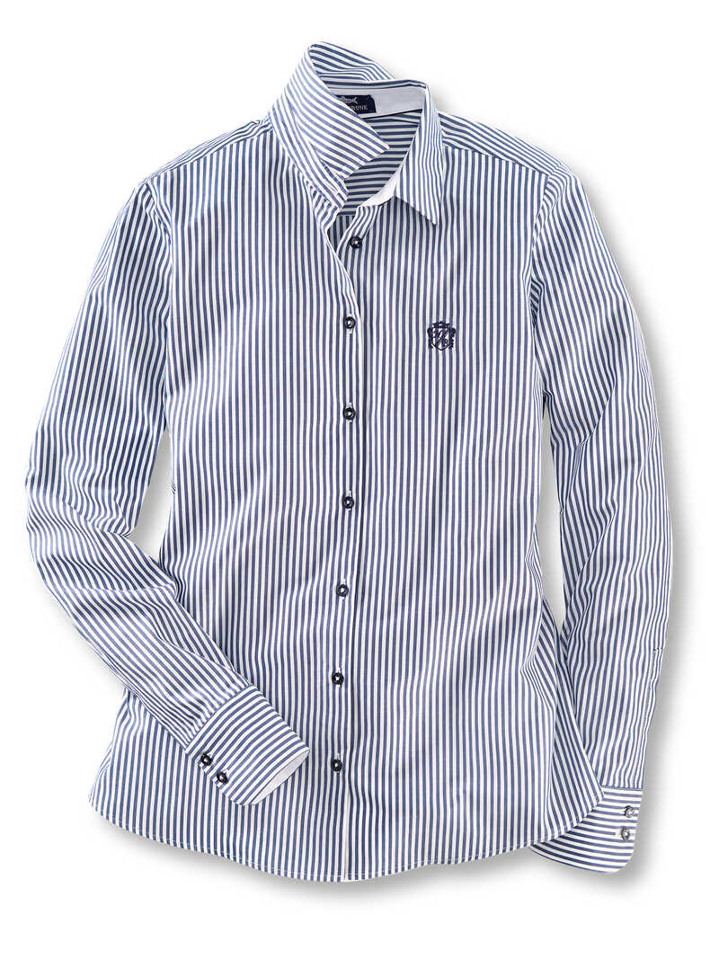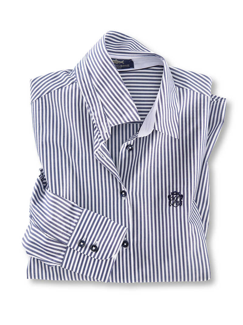 Eine klassische und gutsitzende Bluse - ein Must-have in jeder Garderobe! Genauso eine ist diese Hemdbluse von Herringbone. Mit ihrem stilvollen Streifendessin in Navy-Weiß eignet sie sich für den Businesstermin oder den Geburtstagskaffee hervorragend. Effektvolle Hingucker sind die kleine, navyfarbene Wappenstickerei auf der Brust und der weiße Popelinestoff in den Manschetten und am Kragensteg innen. Das ergibt eine sehr raffinierte Optik bei gekrempelten Ärmeln oder geöffnetem Kragen! Mit gerundetem Saum. Leicht taillierte Passform (Regular Fit) Länge ca. 68 cm. Farbe: navy-weiß. Original Herringbone.