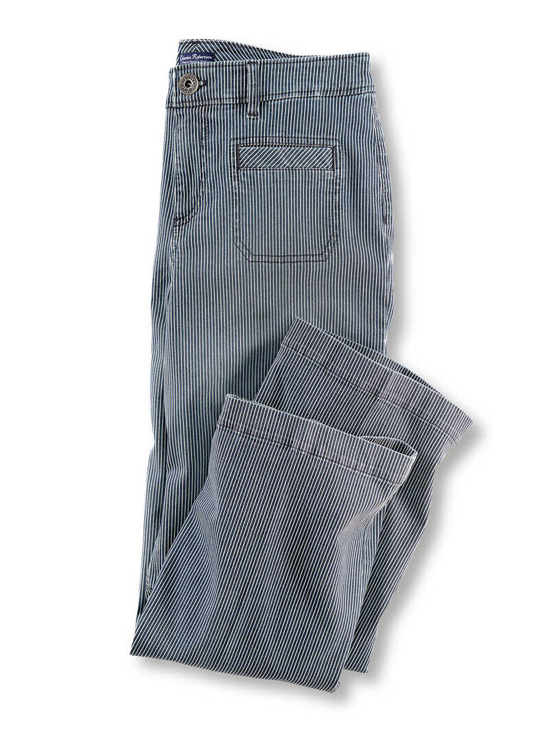 Lust auf einen frischen Streifenlook? Diese Culotte greift ihn mit ihrem superbequemen Denimgewebe und einer modischen 7/8-Länge auf. Dank Elastomultiester und Elasthan ist diese gestreifte Jeans nicht nur unglaublich flexibel, sondern auch noch pflegeleicht und knitterfrei. Zum geraden, weiteren Beinschnitt passen super Sneakers, Slipper oder Ballerinas. Die vorderen zwei Stecktaschen, die zwei hinteren, aufgesetzten Taschen und der etwas höhere Bund machen diese Jeans-Culotte zum Frühlingshit! Weitere Passform (Modern Fit). Fußweite ca. 51 cm; Beininnenlänge ca. 64 cm. Farbe: Navy-Weiß. Original Charles Robertson.