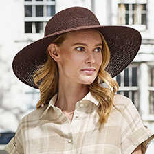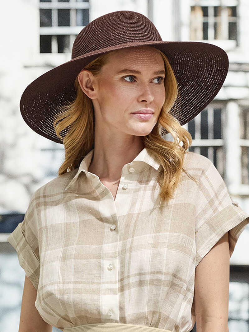 Mit seiner ausladenden, schön geformten Krempe ist dieser Strohhut nicht nur Sonnenschutz, sondern ein richtiger Eyecatcher! Durch das durchlässige Geflecht ist er schön luftig und sorgt für eine angenehme Kopftemperatur. Gerade an sonnigen Tagen ist dieser Hut die erste Wahl als Schattenspender! Mit braunem Hutband innen. Krempe ca. 11 cm breit. Farbe: Braun. Original Helen Leigh.