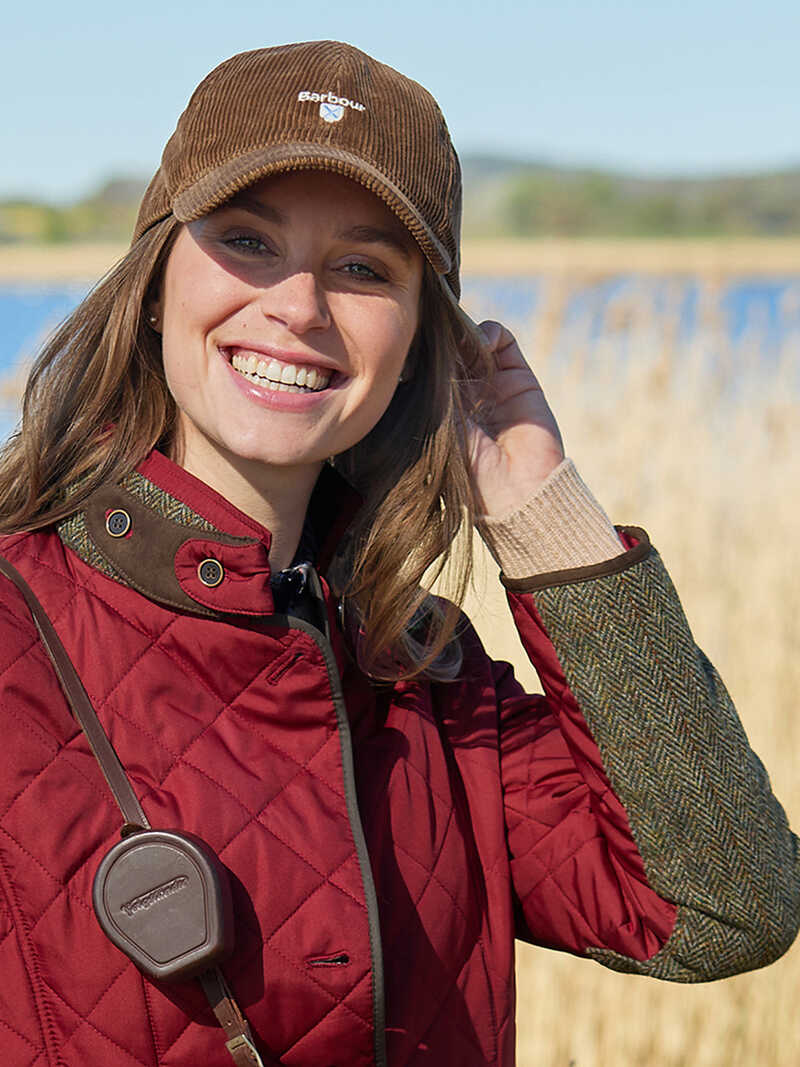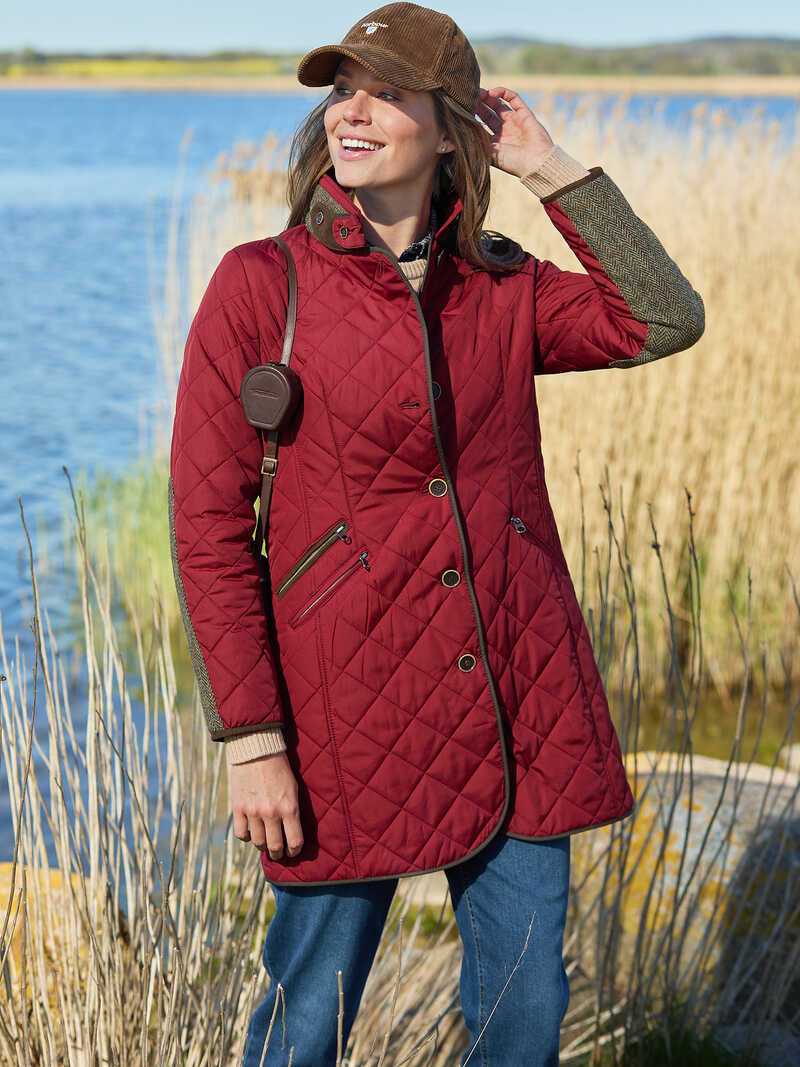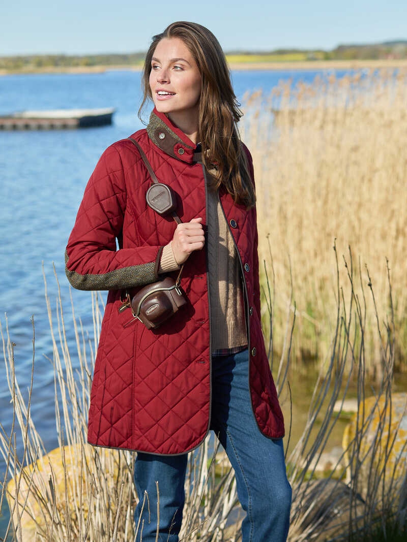 Hier ist er, der Mantel mit Wohlfühlgarantie! Diesmal in einem warmem Rot. Sein besonderes Design aus sportivem Rautenstepp mit modischen Ärmelbesätzen machen ihn zum Blickfang und sein kuschelig warmes Polarfleece-Futter zum winterlichen Highlight. Die modernen Ärmelbesätze sind aus echtem Harris Tweed gearbeitet und ergeben mit ihrem kontrastierendem Fischgratmuster eine unschlagbare Kombi. Genau dieser Tweed ist für seine strapazierfähigen Eigenschaften weltbekannt, deshalb sind diese Patches nahezu unverwüstlich. Der Stehkragen mit Riegel in Velourslederoptik und der Tweedbesatz außen runden den Country Look ab. Mit drei schräg aufgesetzten Metallreißverschlusstaschen und Knöpfen in Hornoptik. Taillierte, feminine Silhouette (Regular Fit). Länge ca. 88 cm. Farbe: mohnrot. Original Wellington of Bilmore.