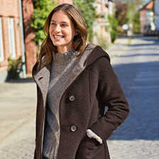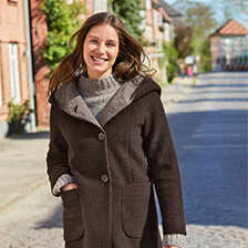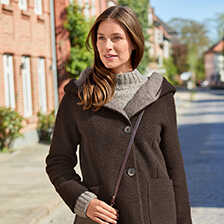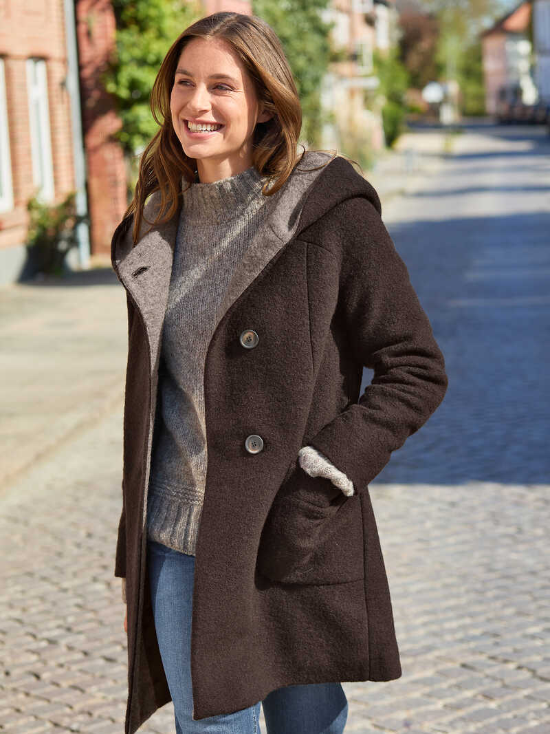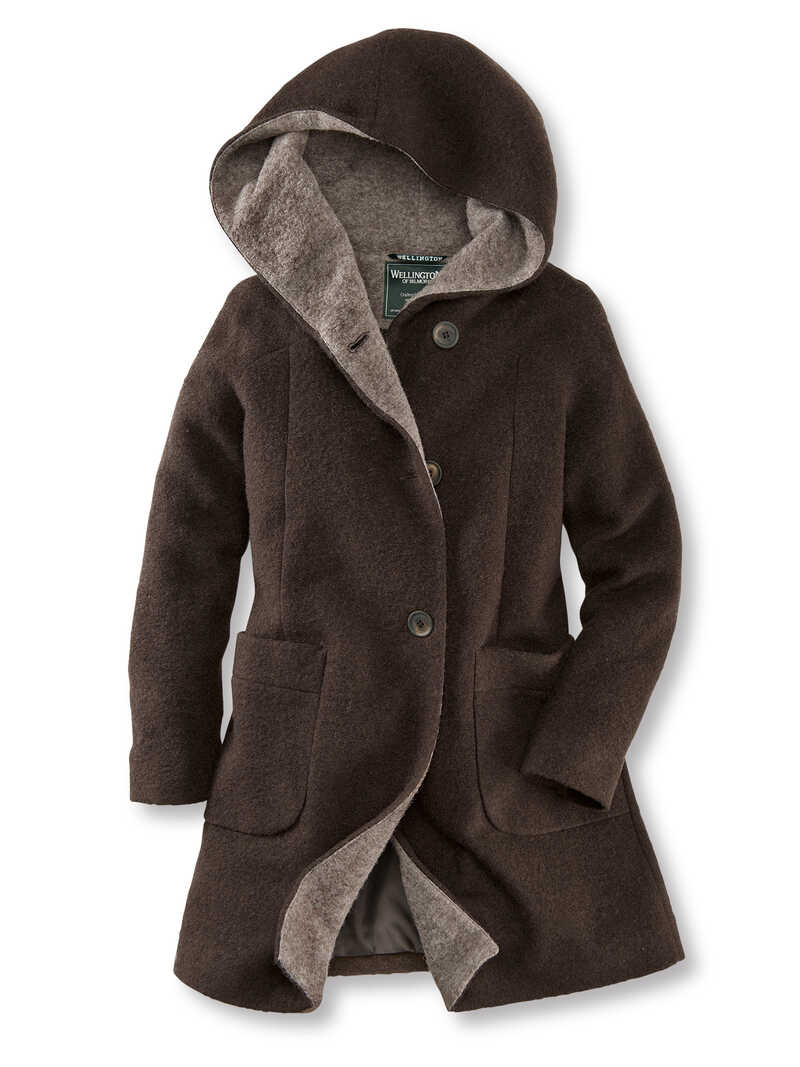 Außen herbstliches Schokoladenbraun und innen flauschig ausgestattet in einem kontrastfarbigen Naturton! Gibt es in dieser Jahreszeit etwas Schöneres, als sich in einen wohlig warmen Kapuzenmantel einzukuscheln? Hayle ist aus weichem Wollwalk gearbeitet und zeigt sich in etwas weiterem, gemütlichem Schnitt und cleanem Look mit aufgesetzten Taschen, Knöpfen in Hornoptik und Raglanärmeln. Ein absolutes Wohlfühlteil für den Herbst und Winter! Normale Passform (Regular Fit). Länge ca. 85 cm. Farbe: chocolate. Original Wellington of Bilmore.