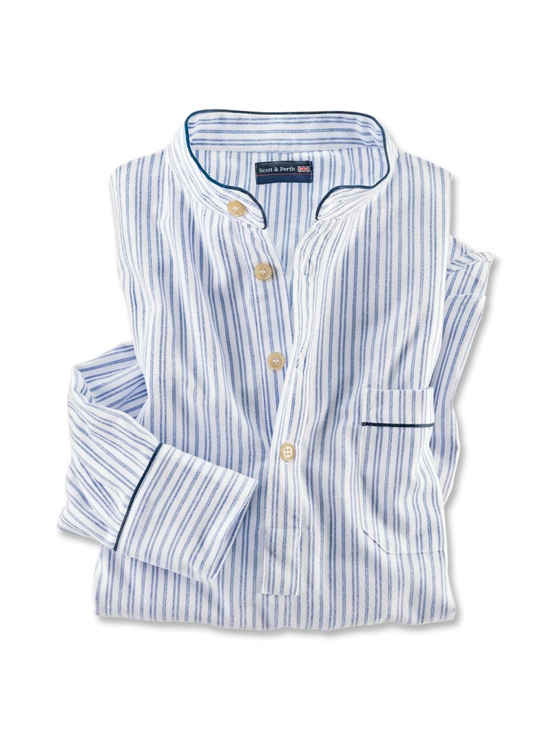 Typisch englisches Country Feeling erleben Sie in diesen herrlich warmen, weichen Nachthemden (Nightshirts) und Schlafanzügen (Pyjamas), die Scott & Perth aus angenehm softem Flanellgewebe (reine Baumwolle) herstellt. Nightshirt und Pyjama bieten wir in unterschiedlichen Dessins an: In 'Old Times'-Dessin (blau/weiß gestreift), im rot-karierten 'Royal Stewart'-Tartan sowie im blau-grünen 'Black Watch'-Tartan.