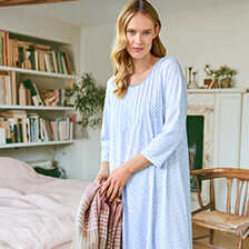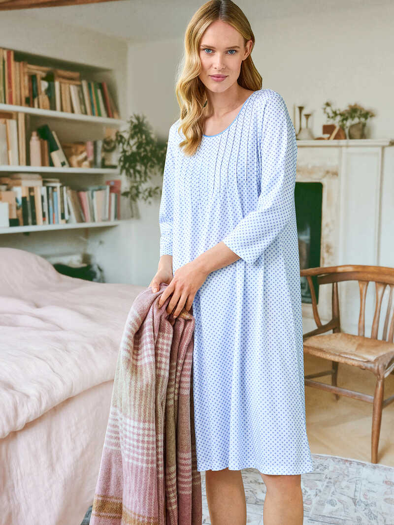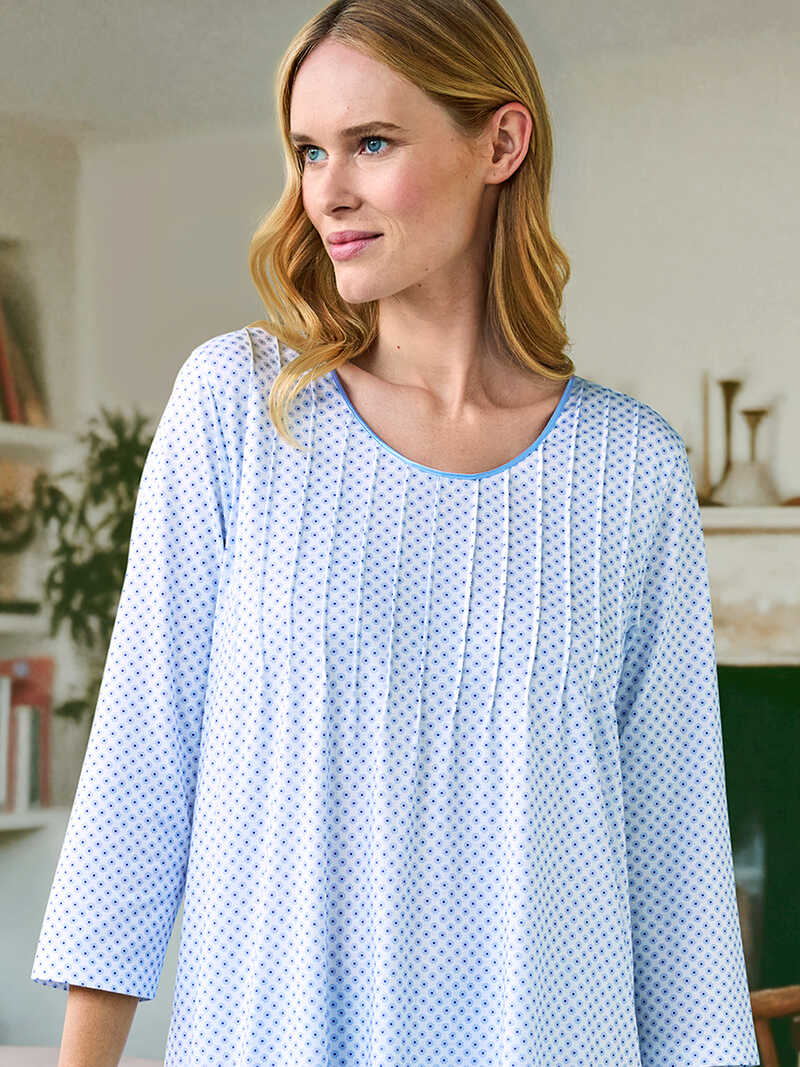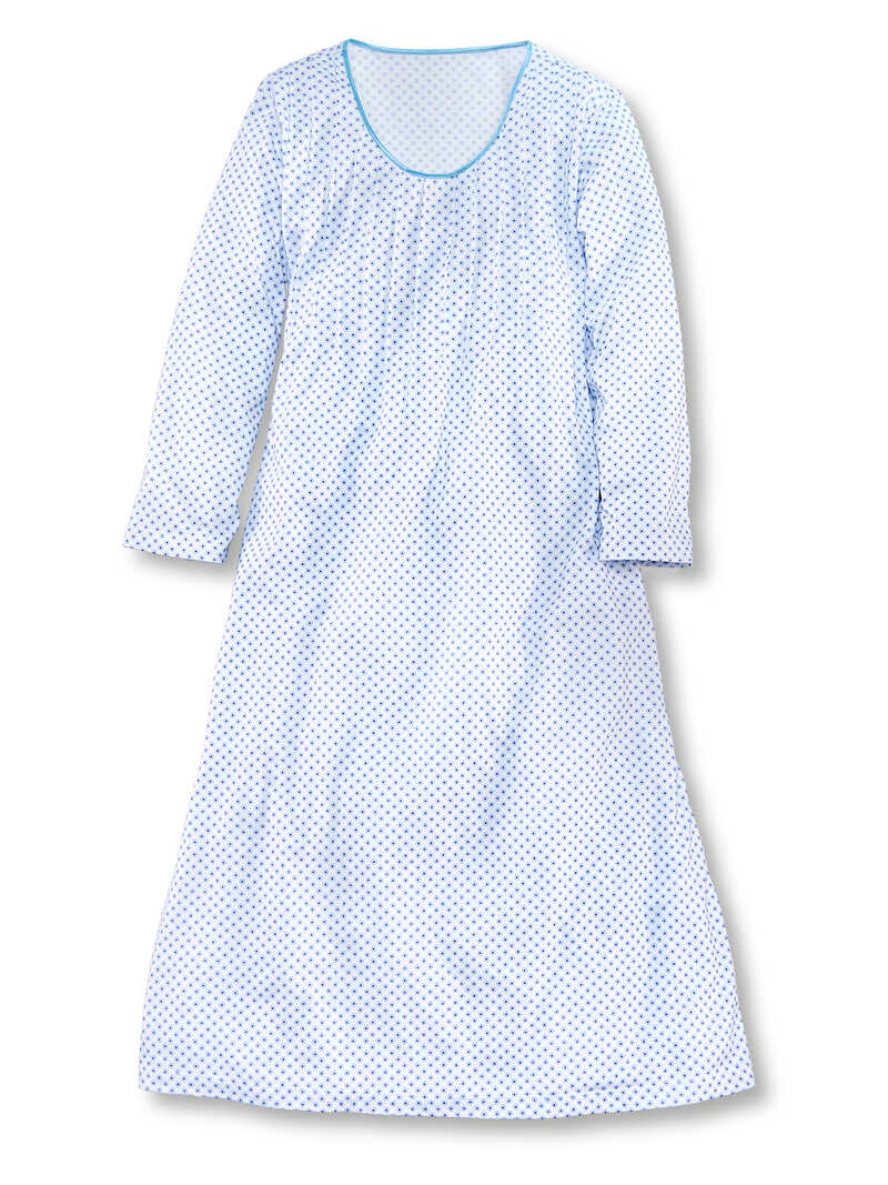 Unvergleichlich weich und geschmeidig umhüllt dieses wundervolle Nachthemd aus edel fließendem Jersey ihre Figur. Es zeigt sich im abstrakt-romantischen Blumenprint und stammt aus dem englischen Traditionshaus Bonsoir of London, seit 1926 bekannt für Nachtwäsche aus feinsten Materialien. Die leicht schmeichelnde A-Linie ist herrlich bequem und entsteht durch die zart abgesteppten Biesen im Oberteil, die dem Nachthemd einen femininen Touch verleihen. In knieumspielender Länge, mit 3/4-Ärmeln und Rundhalsausschnitt. Ausgestellte Passform (Comfort Fit). Länge ca. 103 cm. Farbe: Weiß-Blau. Original Bonsoir, London.
