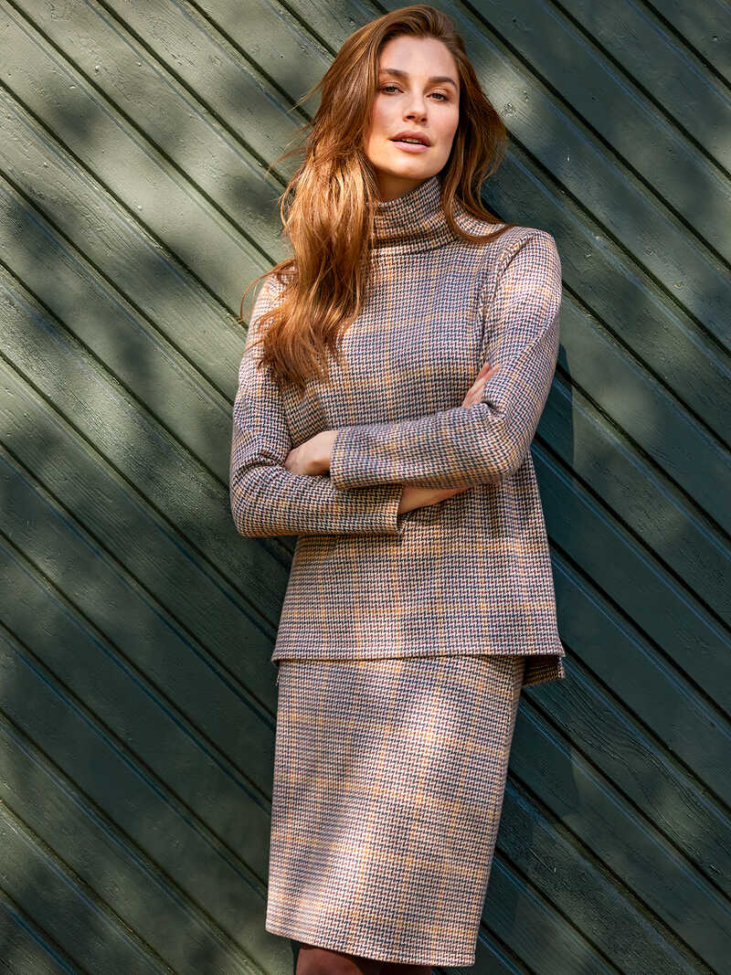 Diese Shirt-Rock-Kombination deckt die komplette Range ab! Vom schicken Businesstermin bis zum bequemen, aber stilvollen Reiseoutfit. Das Allerbeste: beide Teile lassen sich auch prima einzeln kombinieren. So bietet sich eine wahre Fülle an Kombinationsmöglichkeiten. Bordeaux, Navy und Camel ergeben auf dem weichen Jersey ein grandioses Check. Das Oberteil ist locker geschnitten, hat einen kleinen, weiten Rollkragen, lange Ärmel und zwei kleine Seitenschlitze im Saum, der hinten etwas länger ist. Der Rock ist leicht ausgestellt mit einem schmalen, elastischen Bund und seitlichem Reißverschluss. Unkompliziert und bequem - dieses Set verspricht ein entspanntes Outfit mit Stil! Regular Fit. Länge Oberteil ca. 62 cm; Länge Rock ca. 58 cm. Farbe: bordeaux-navy-camel. Original Charles Robertson.