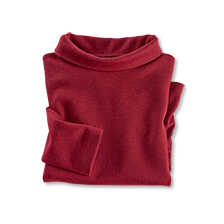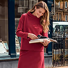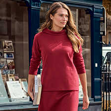 Ob zusammen oder getrennt getragen - dieser Zweiteiler in kräftigem Karminrot bietet so viele Kombinationsmöglichkeiten! Der feine, weiche Wolljersey spendet nicht nur angenehme Wärme, sondern macht das Duo auch noch herrlich gemütlich. Das locker geschnittene Oberteil besitzt einen kleinen, weiten Rollkragen, lange Ärmel und zwei kleine Seitenschlitze im Saum, der hinten etwas länger ist. Der Rock ist leicht ausgestellt, mit einem schmalen, superbequemen Gummizug-Bund und Nahtreißverschluss. Regular Fit. Oberteil: Länge ca. 62 cm. Rock: Länge ca. 58 cm. Farbe: karminrot. Original Charles Robertson.