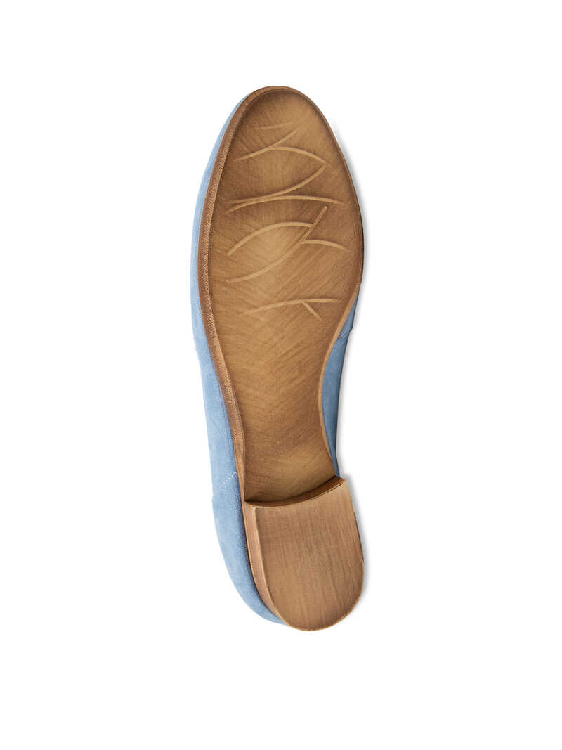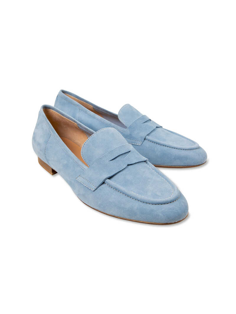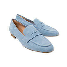 Einfach reinschlüpfen und los! Ein Pennyloafer ist total unkompliziert, ein absoluter Klassiker unter den Schuhen und lässt sich von März bis Oktober tragen. Seinen Namen trägt er wegen seines schicken Lederriemens über dem Spann. Unter diesem wurde in früheren Zeiten ein Penny geklemmt, der der Trägerin Glück bringen sollte. Was für ein schönes, traditionelles Glücksritual! Unser Pennyloafer zeigt sich ganz angesagt in softem, hellblauem Veloursleder. Ein absolutes Must-have, denn Pennyloafer lassen sich zu sportiven oder schicken Outfits tragen! Absatzhöhe ca. 1,5 cm. Farbe: Hellblau. Original Kensington.