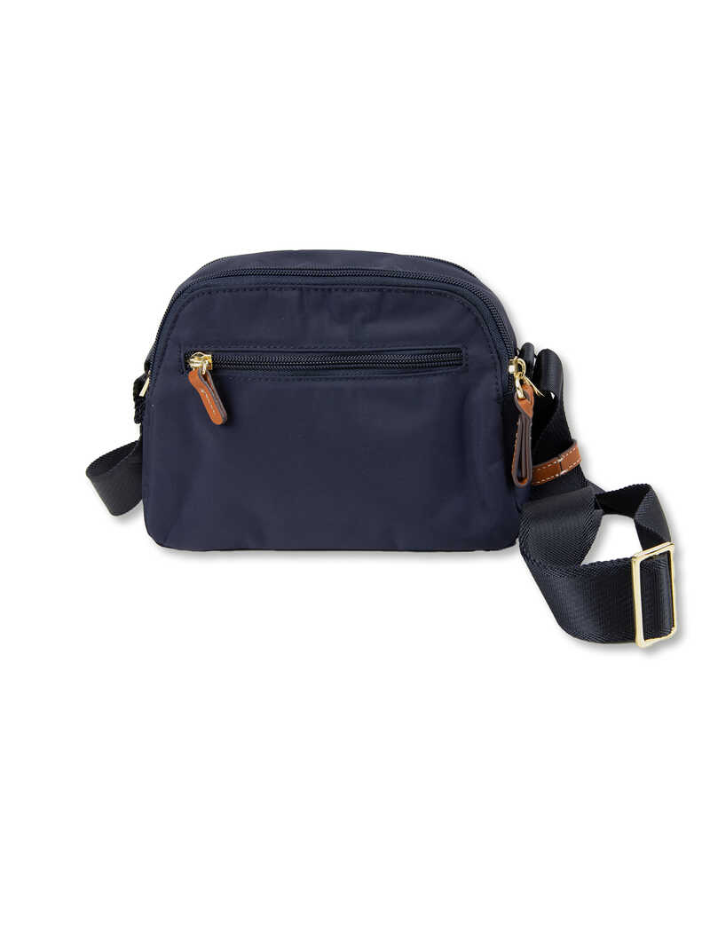 Ein richtiges kleines Raumwunder ist diese praktische Umhängetasche von Bric's! Nicht zu groß, dafür perfekt für unterwegs und dank ihrer vielen Fächer sehr geräumig. Zu den beiden Reißverschluss-Hauptfächern findet sich noch ein weiteres Zipperfach auf der Rückseite. Selbst innen gibt's noch ein Steck- und ein Reißverschlussfach. Das recycelte Nylon in Navy ist schön leicht und robust. Details aus cognacfarbenem Leder und der verstellbare, leicht satinierte Schulterriemen (max. 155 cm) machen diese Tasche zum sportiven Allrounder im Alltag! Komplett gefüttert (Textil). Maße 22 x 16 x 9 cm. Farbe: navy. Original Bric's.