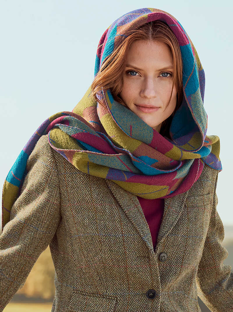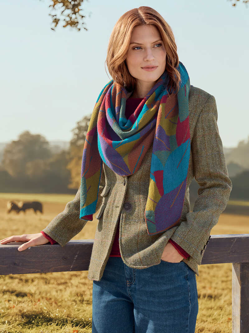 Ein Hauch von Irland, eingefangen in diesem umwerfend schönen Stricktuch! Ein Meer aus stilisierten Blättern, die in ihren starken Herbstfarben perfekt zur Geltung kommen. Die kleine, irische Manufaktur McKernan hat dieses Tuch in modischer Dreiecksform und ausgefeilter Jacquard-Stricktechnik designt. So ist jede Seite für sich ein stimmiger Blickfang. Das großzügige Format und die kuschelweiche Merinowolle ergeben ein wunderbares Duo an kalten Tagen!Größe 235 x 65 cm. Farbe: multicolor. Original McKernan. Made in Ireland.