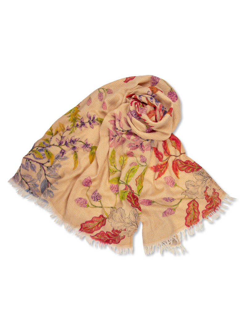 Ausdrucksstarkes Fischgratgewebe trifft auf einen Hauch von Romantik! Ein zarter Blütendruck, der fast wie Malerei wirkt, verleiht diesem herbstlichen Schal seine faszinierende Optik. Die kräftigen Farben setzen lebendige Akzente und durchbrechen das klassische Fischgratmuster in Camel und Ecru. Wärmendes Wollgewebe sorgt für angenehmes Tragen an kühlen Tagen. Mit offenen Fransen an den kurzen Seiten. Größe 180 x 70 cm. Farbe: camel. Original Helen Leigh.