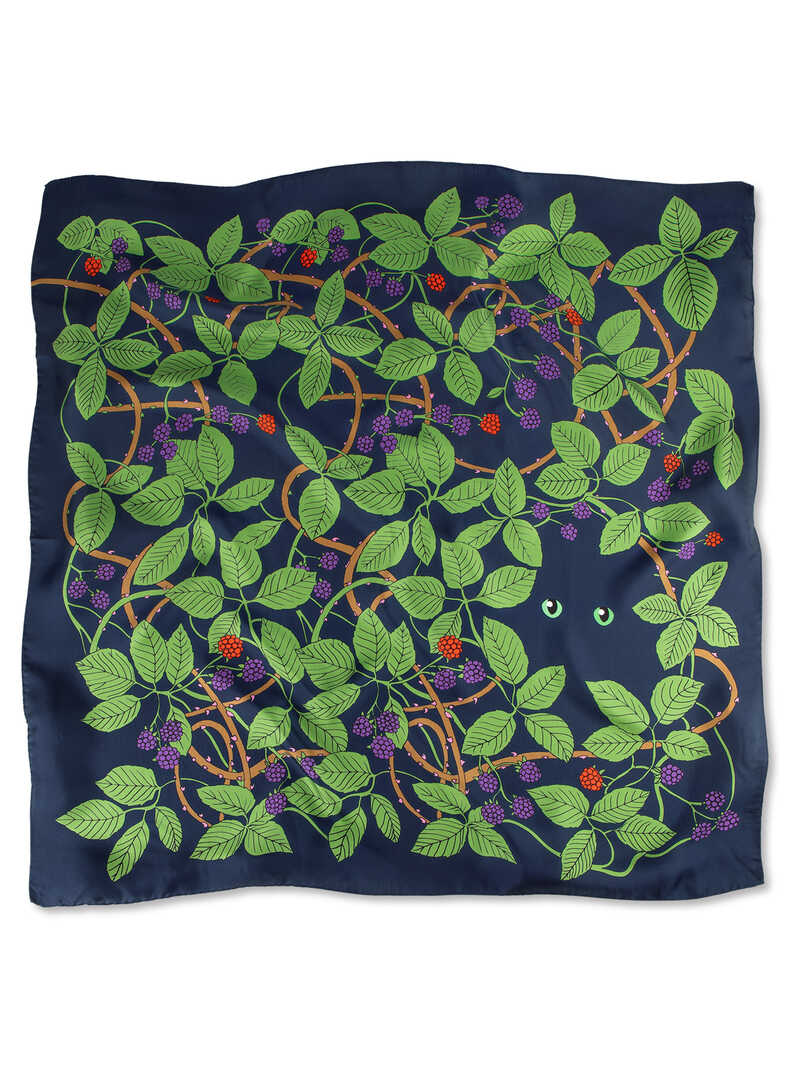Die Londoner Designerin Karen Mabon ist bekannt für ihre fantasievollen Motive auf exklusiven Seidentüchern. Bei diesem umwerfenden Tuch schauen zwei große Katzenaugen aus dem Brombeerdickicht frech hervor. Ein Motiv zum Schmunzeln, typisch Karen Mabon! All ihre Illustrationen werden von der Künstlerin zuerst von Hand gezeichnet, um diese dann auf das Tuch zu drucken. Auf dem nachtblauen Seidentwill bekommt die Farbigkeit der Blätter und Brombeeren eine brillante Leuchtkraft. Mit rollierten Kanten. Lieferung in schöner Geschenkbox. Größe 90 x 90 cm. Farbe: nachtblau. Original Karen Mabon.