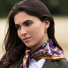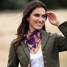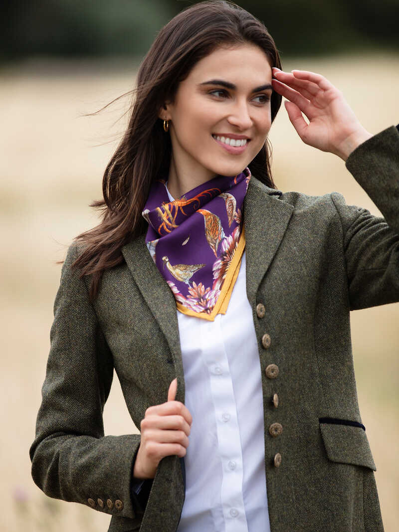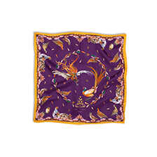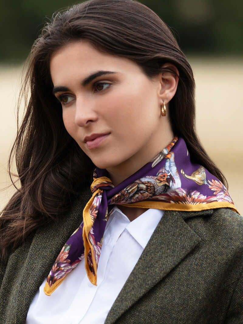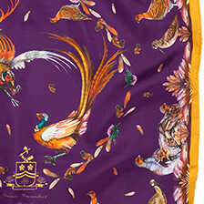Sensationelles Design auf einem ausgefallenen Nickituch aus wertvoller Seide - eindeutig die Handschrift der britischen Künstlerin Clare Haggas! Schon von weitem sieht man die Strahlkraft und Brillanz der Farben. Schwungvoll gemalte Fasane und andere Vögel reihen sich zu einem spektakulären Gesamtbild auf dem auberginefarbenen Hintergrund auf. Umrahmt wird das Ganze in strahlendem Goldgelb. Lieferung in exklusiver Geschenkbox. Mit von Hand rollierten Kanten. Größe 50 x 50 cm. Farbe: aubergine. Original Clare Haggas.