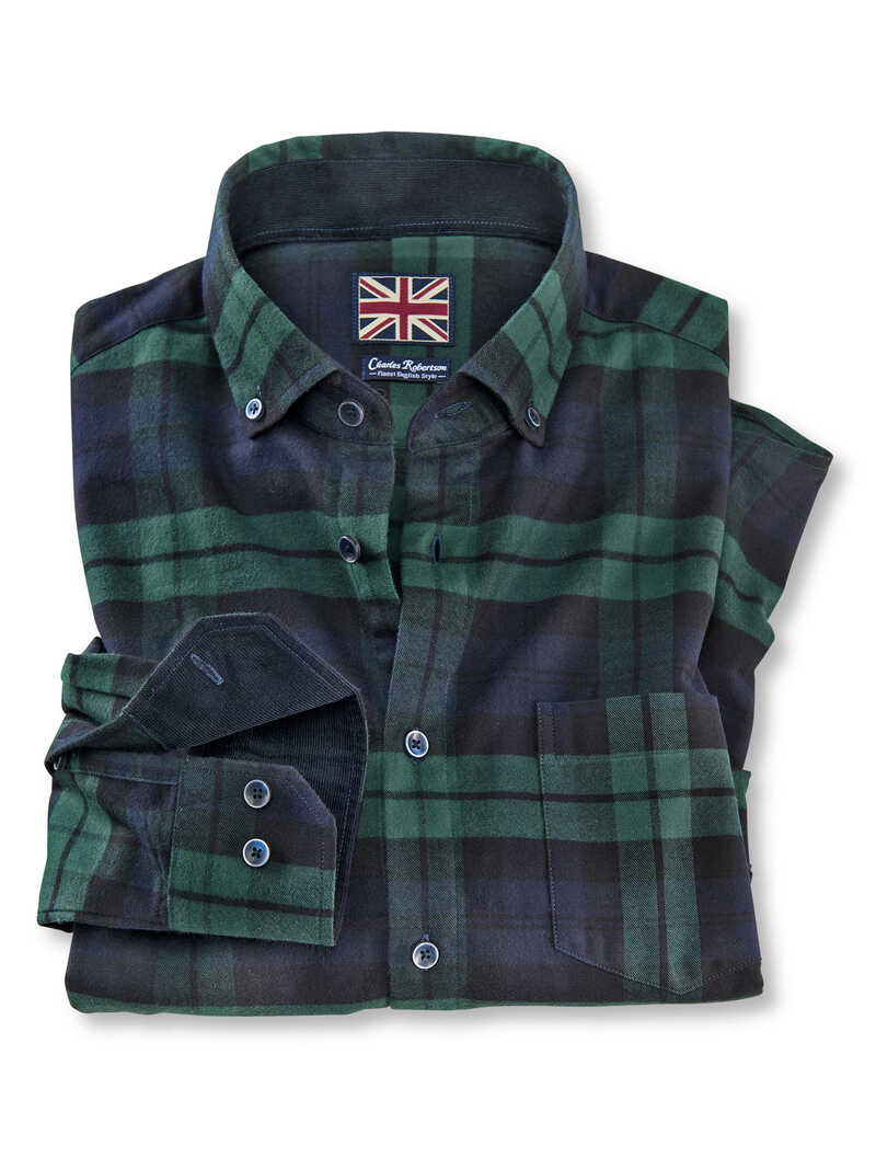 'Black Watch', das traditionelle Schottenkaro, gibt diesem Hemd seinen ausdruckstarken Charme! Es wirkt auf dem feinen, superweichen und wärmenden Flanellgewebe etwas softer als normalerweise, was den winterlichen Look wunderbar unterstreicht. Schönes Detail bei gekrempelten Ärmeln sind die navyfarbenen Cordbesätze in den Manschetten, genauso wie der InnenkragenCordbesatz. Dieses Hemd mit seinem authentischen Design ist zeitlos, stilvoll und kann trotzdem cool kombiniert werden: Mit navyfarbenem Rolli drunter gelingt schnell ein moderner Winterlook! Mit 'Button Down'- Kragen, verstellbaren Manschetten, aufgesetzter Brusttasche und gerundetem Saum. Normale, schlanke Passform (Modern Fit). Länge ca. 80 cm. Farbe: navy-grün. Original Charles Robertson.