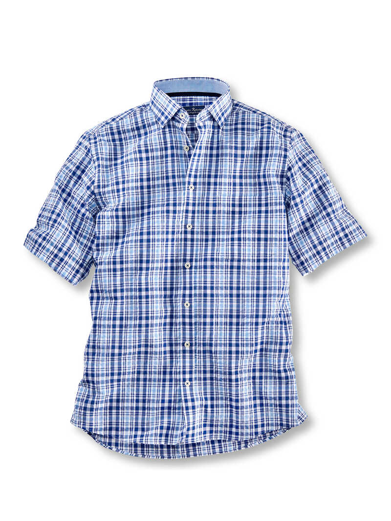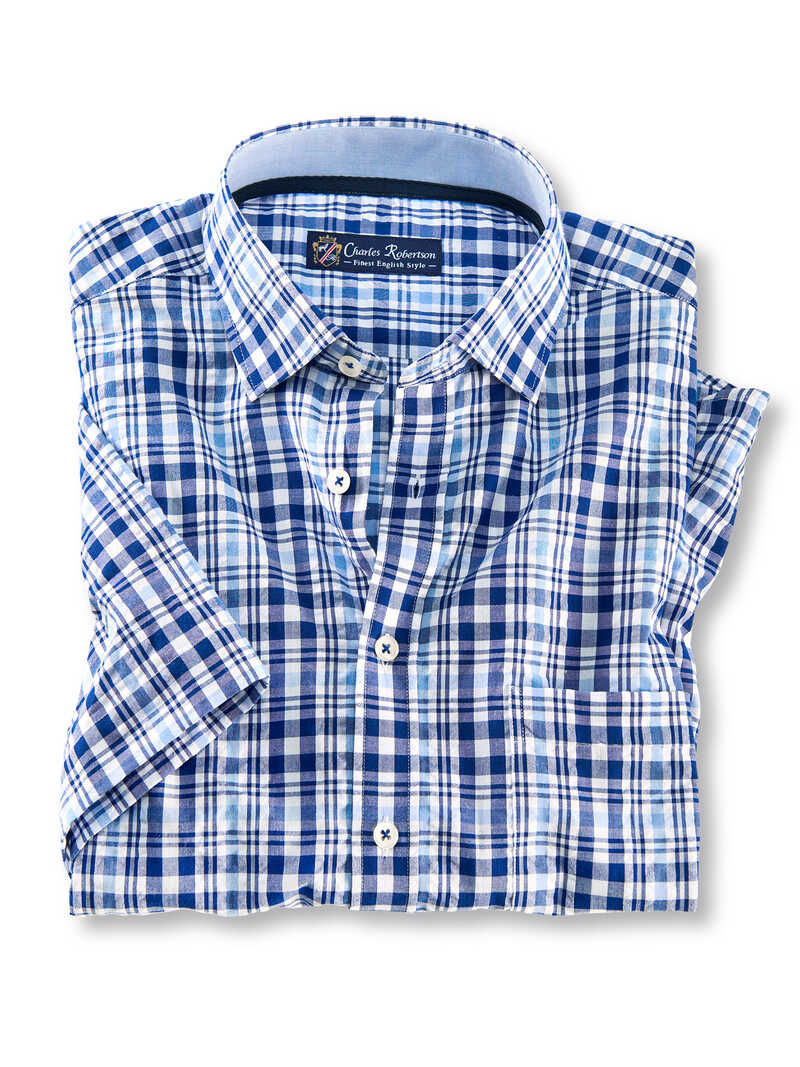 Seersucker ist für den Sommer einfach genial! Das Gewebe aus 100% Baumwolle hat eine coole, leicht gekreppte Struktur, die nicht nur lässig aussieht, sondern auch sehr praktisch ist. Es liegt locker auf der Haut, lässt Luft zirkulieren und sorgt dafür, dass man selbst bei höheren Temperaturen entspannt bleibt. Der Mix aus verschiedenen Blautönen macht das Hemd zum perfekten Allrounder. Egal, ob für den Alltag, Sommerpartys oder den nächsten Urlaub, dieses Hemd ist easy, pflegeleicht und passt zu Jeans, Chinos und Bermudas. Ausgestattet mit Kentkragen, kurzen Ärmeln, aufgesetzter Brusttasche und abgerundetem Saum. Bequeme Passform (Comfort Fit). Länge ca. 82 cm. Farbe: Blau Multi. Original Charles Robertson.