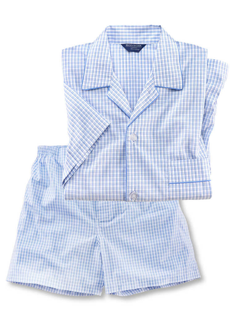 Das neue, moderne Edel-Karodessin dieses Shorty-Pyjamas machen optisch was her. Dazu macht sich das herrlich glatte, kühlende Baumwollgewebe in feinster Qualität einfach hervorragend. Dieser leichte Pyjama kommt aus dem Hause Bonsoir of London und besticht durch seine hochwertigen Details, wie den Paspelierungen am Kragen und der Brusttasche. Das geknöpfte Kurzarm-Oberteil ist mit Reverskragen ausgestattet und die Shorts mit elastischem Bund und geknöpftem Hosenschlitz. Beide Teile haben eine bequeme Weite, sodass nichts einengt. Bequeme Passform (Comfort Fit). Farbe: Blau-Weiß. Original Bonsoir of London.