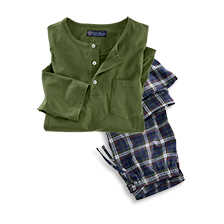 An Bequemlichkeit kaum zu übertreffen ist dieser Pyjama in modischem Highland-Tartan. Das Langarmshirt ist aus weichem Baumwolljersey gearbeitet und wirkt durch seine kleine Knopfleiste und die aufgesetzte Brusttasche sehr sportiv. Einen tollen Kontrast zum unifarbenen Oberteil bildet die flauschig weiche Flanellhose mit ihrem Schottenkaro. Sie besitzt einen elastischen Bund mit einem Bindeband und seitliche Taschen. Das Beste an diesem Relax-Duo: Oberteil und auch Hose lassen sich spielend leicht mit anderen Teilen kombinieren. Bequeme, gerade Passform (Comfort Fit). Farbe: oliv-navy. Original Charles Robertson.