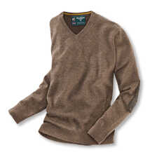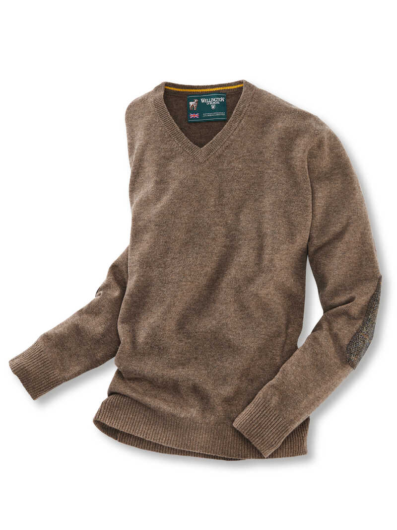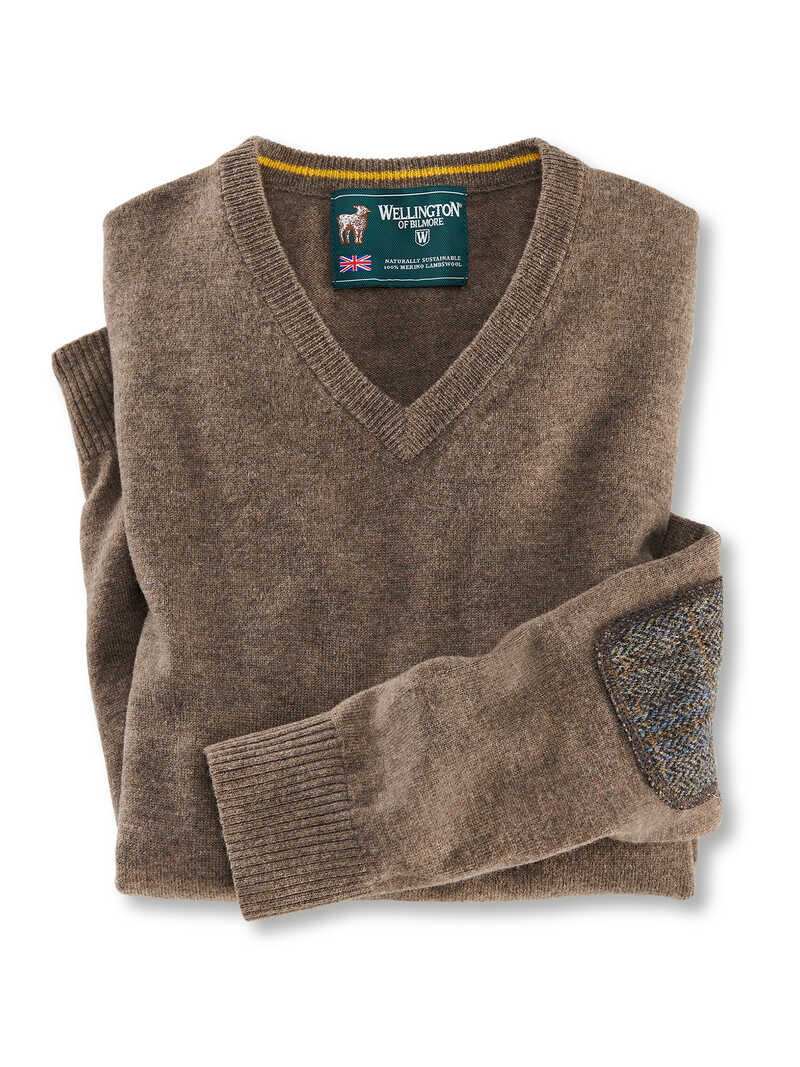Dieser Pullover ist ein Basicteil, wie man(n) es sich wünscht! Er ist schön leicht und eignet sich daher auch zum Tragen unter Sakkos. Solo getragen ist er kaum zu überbieten. Sein melierter Camelton in Kombination mit den Ärmelpatches aus echtem Harris Tweed machen ihn zum Eyecatcher. Nicht zu viel und nicht zu wenig, genauso wird dieser Lambswool-Pullover zum besonderen Basic. Mit Ärmel- und Saumbündchen. Normale Passform (Regular Fit). Farbe: Camel. Original Wellington of Bilmore.