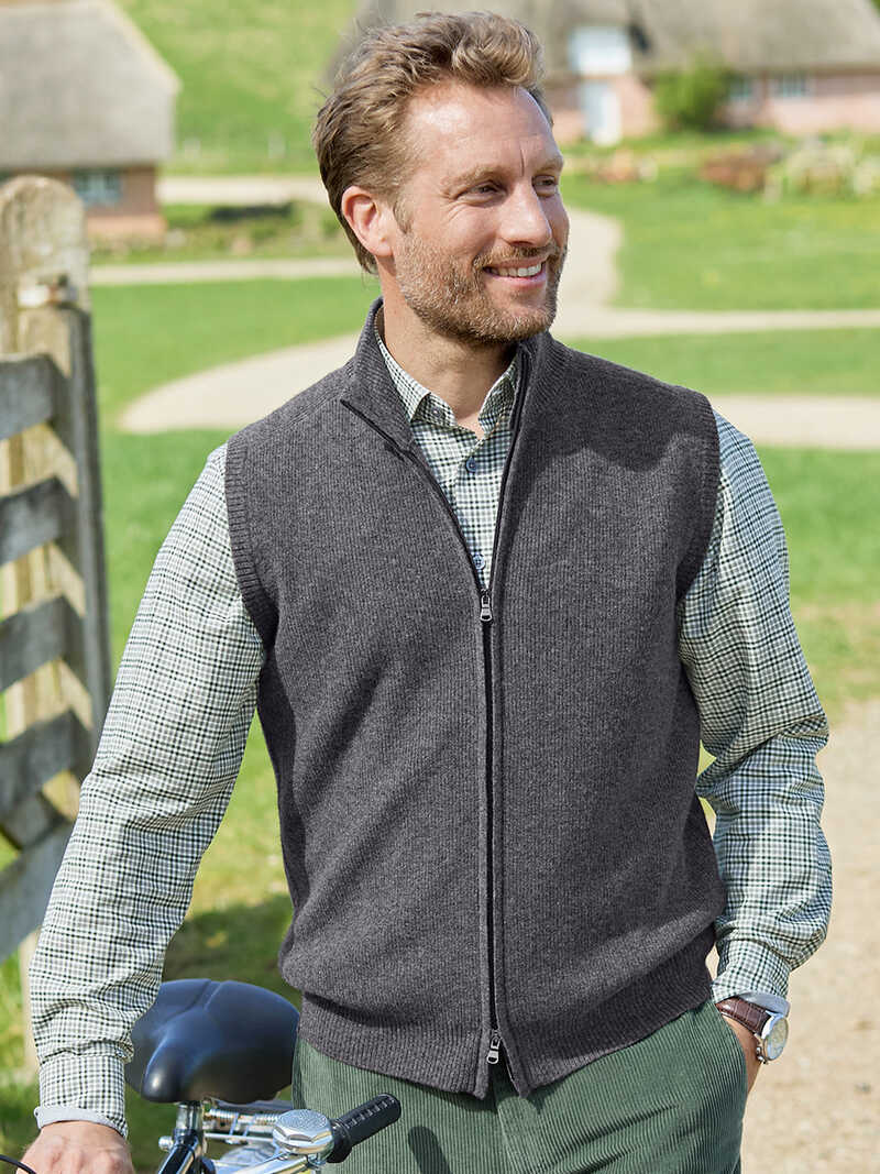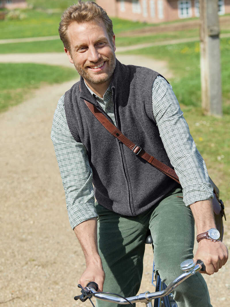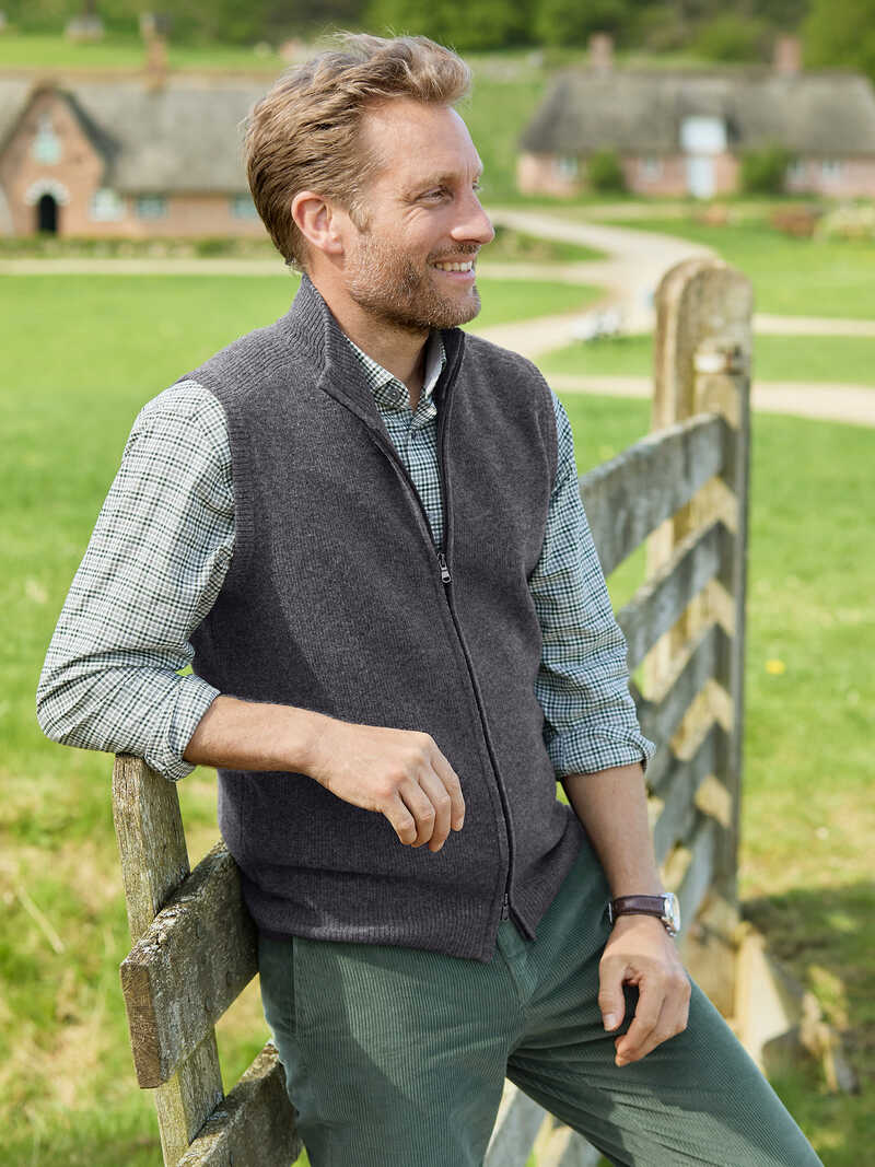 Ob über Shirts oder Hemden getragen oder als wärmende Extraschicht unter Jacken - Strickwesten sind richtige Multitalente und liegen im Trend wie lange nicht! Diese hier ist dank ihres superweichen Feinstricks aus 100 % extrafeiner Merinowolle der perfekte Bodywarmer für das ganze Jahr. Der verdeckte Zweiwege-Zipper sorgt für eine cleane Optik und macht sie im Alltag besonders praktisch. Ihr klassischer Graumelange-Ton ist zeitlos und toll zu kombinieren. Ein Stehkragen sowie elastische Strickbündchen an den Ärmelausschnitten und am Saum sorgen für guten Sitz und runden das Gesamtbild stilvoll ab! Normale Passform (Regular Fit). Länge ca. 70 cm. Farbe: grau melange. Original Charles Robertson.