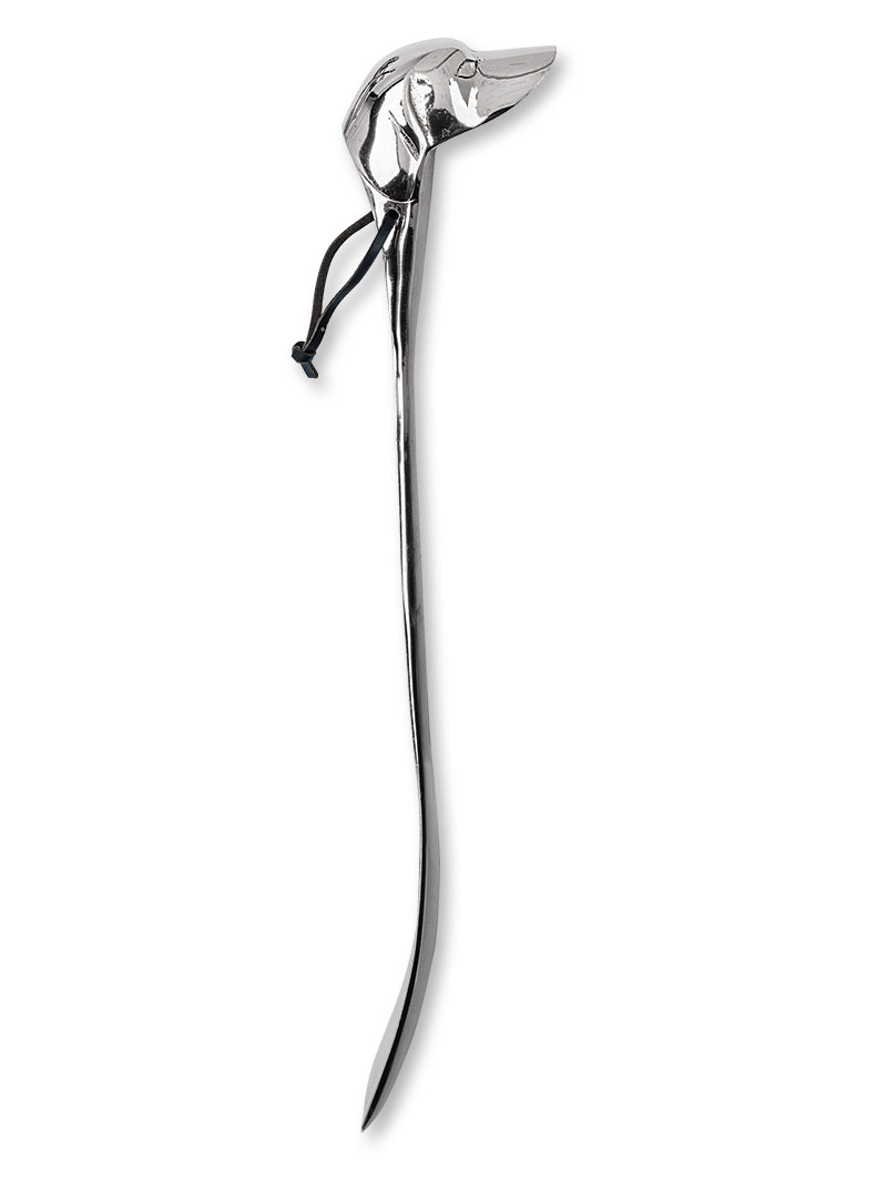 Dieser pfiffige Schuhanzieher mit einem Griff in Form eines Dackels (engl. dachshund) sieht nicht nur gut aus, sondern ist auch äußerst praktisch! Mit einer Länge von 52 cm (!) wird das Anziehen der Schuhe zum Kinderspiel! Aus vernickeltem Aluminium, mit Lederschlaufe zum Aufhängen. Größe 52 x 5 cm. Original Mars & More.