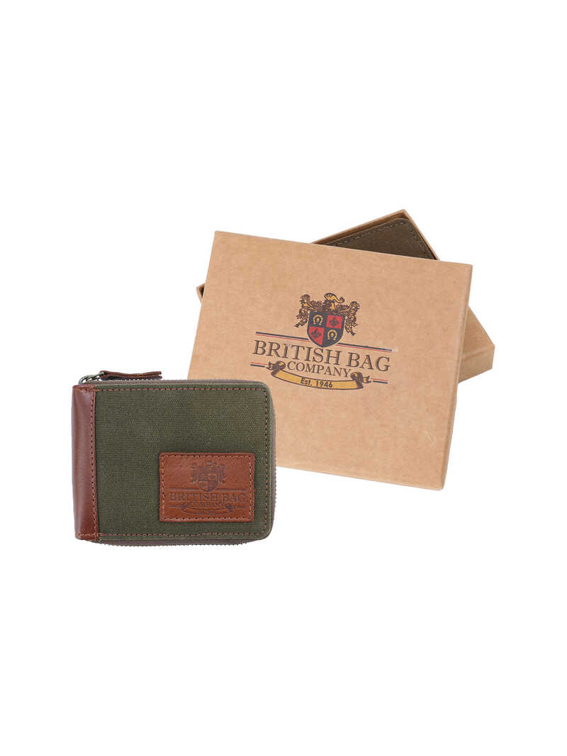 Diese kompakte Geldbörse im Country-Look mit Rundum-Reißverschluss bietet eine klassische Aufteilung: separates Münzfach mit Druckknopf, drei Kartenfächer, Geldschein- und Ausweisfach. Aus robustem khakifarbigen Canvasstoff und braunem, robustem Leder mit Logo-Prägung. Größe etwa 12 x 9,5 cm. Original British Bag Company.