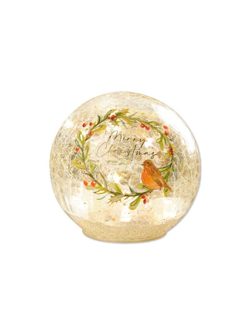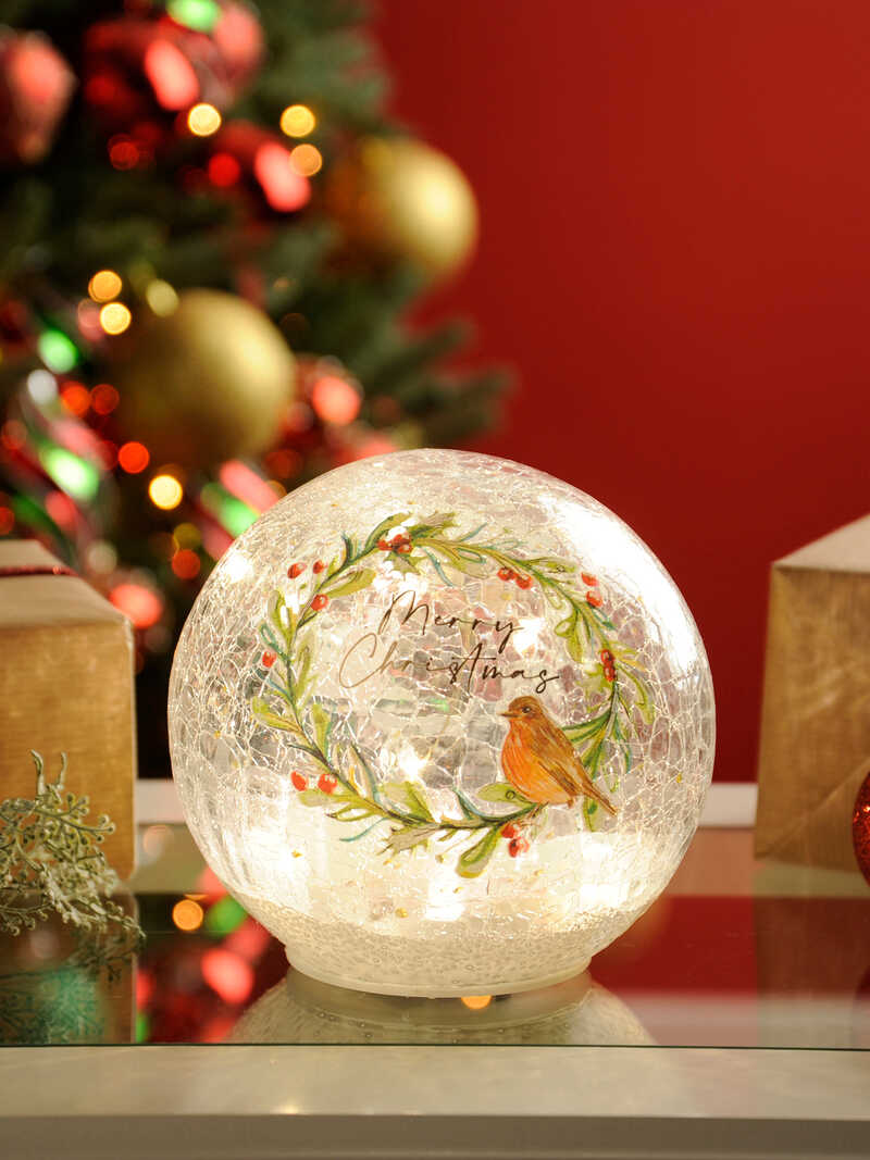 Diese trendige Glaskugel im Krakelier-Design bringt Ihre Weihnachtsdekoration wunderschön zum Erstrahlen! Die 15 cm (Durchmesser) große Glaskugel ist liebevoll verziert mit dem traditionellen Motiv zweier Rotkehlchen. Innen leuchten 12 batteriebetriebene LEDs mit warmem Licht und lassen die dunkle Jahreszeit ein wenig heller und gemütlicher werden. Lieferung inkl. 3 AA-Batterien. Nur für Innennutzung geeignet. Durchmesser 15 cm. Original Festive Productions, Cwmbran in Südwales.