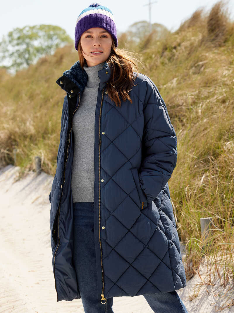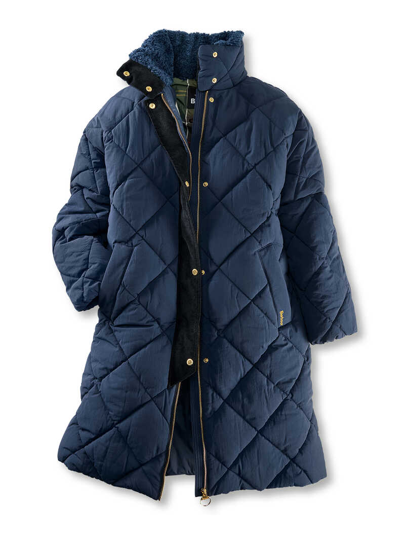 Anziehen und wohlfühlen! Dieser knielange Steppmantel hat die ideale Länge, um sich auch bei kälteren Temperaturen so richtig einzukuscheln. Durch seine bequemweite und lockere »Cocoon Shaped«-Form ist der Barbour-Mantel unglaublich modisch geschnitten. Das Navy ist zeitlos und lässt sich wunderbar leicht kombinieren. Ein Highlight ist der hohe Stehkragen, der innen mit flauschig-weichem und wärmendem Teddyplüsch gefüttert ist. Eine verkürzte, modische Cordleiste mit Druckknöpfen ist ein effektvoller Akzent über dem Reißverschluss. Mit zwei seitlichen Schubtaschen, einer Innentasche und Barbours beliebtem Tartanfutter. Kurzum, ein Oversized-Mantel, der im Winter ein toller, wärmender Begleiter ist! Mit Logo-Stickerei auf der linken Tasche. Oversized Passform (Modern Fit) - fällt groß aus. Länge ca. 104 cm. Farbe: Navy. Original Barbour.