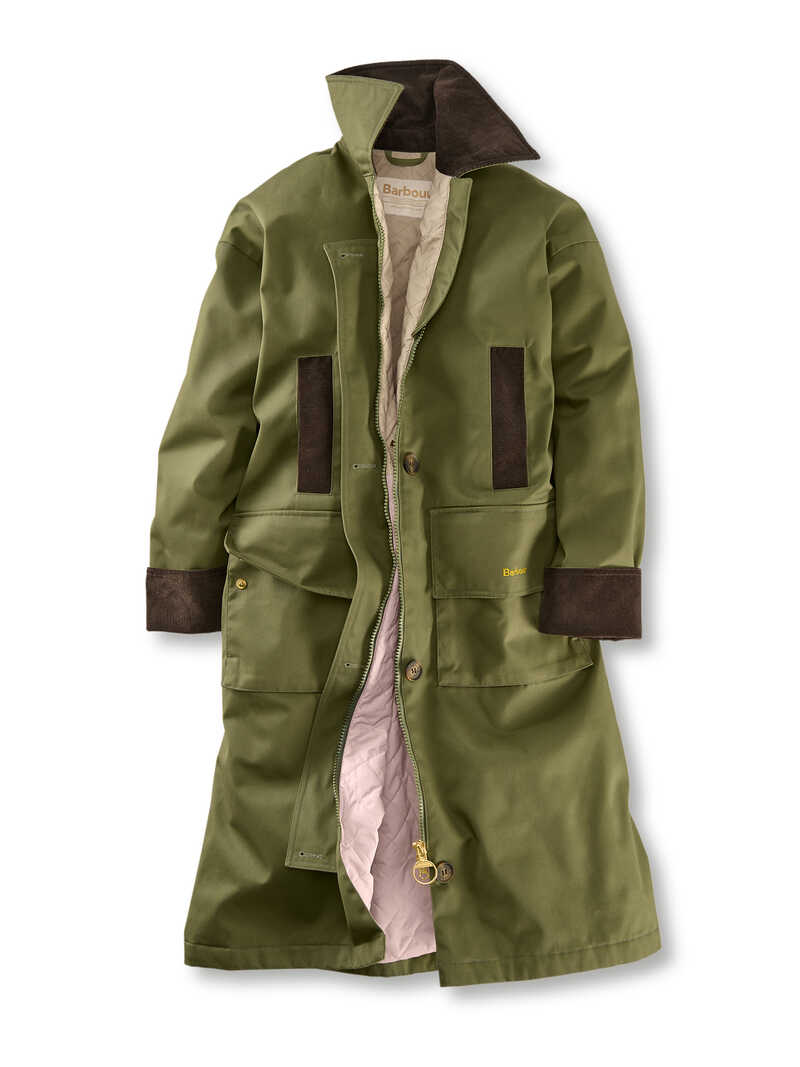 Mit diesem coolen, langen Regenmantel von Barbour ist der Regen nur noch halb so schlimm! Er ist ganz neu im Sortiment und reiht sich garantiert ein in die Erfolgsriege des Outdoorspezialisten. Sein olivfarbenes Funktionsmaterial ist wind-, wasserdicht und trotzdem angenehm atmungsaktiv. Die typischen Barbourdetails, wie der dunkelbraune Feincord am Kragen, an den Ärmelaufschlägen und an den Leistentaschen bilden einen markanten Kontrast. Superlässig zum Oliv und Braun findet sich innen ein gestepptes Futter in zartem Rosa. Mit aufgesetzten, großen Klappentaschen, sowie Zweiwege-Reißverschluss, Knopfleiste und einer Innentasche. Wer schon mal nach einem modernen Wettermantel gesucht hat, der weiß, dass man einen wie diesen nicht so schnell findet! Mit Logo-Stickerei auf der linken Tasche. Gerade, weite Passform (Modern Fit) - fällt groß aus. Länge ca. 107 cm. Farbe: Oliv. Original Barbour.
